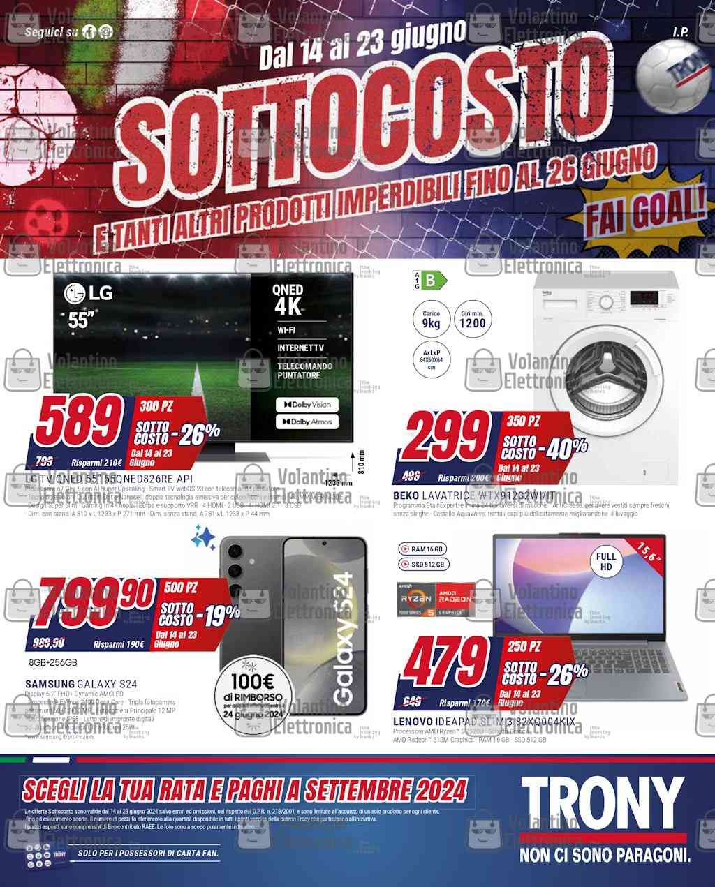 Vediamo in anteprima il volantino Trony dal 14 giugno 2024, che si apre subito con le offerte Sottocosto che dureranno fino al 23 giugno, mentre il resto del volantino si protrae fino al 26 giugno 2024. Tra i tanti prodotti di elettronica che Trony propone in sconto troviamo le offerte TV per approfittare del nuovo televisore per guardare le partite degli Europei 2024 insieme agli amici (o anche da soli!), per poi passare a smartphone e accessori, computer e vari elettrodomestici, fino allo Speciale Clima, con il quale acquistare in sconto un nuovo condizionatore, oppure ventilatori e climatizzatori portatili. Vi ricordiamo che il numero di pezzi indicato accanto al prezzo del Sottocosto è relativo alla disponibilità complessiva in tutti i negozi Trony.