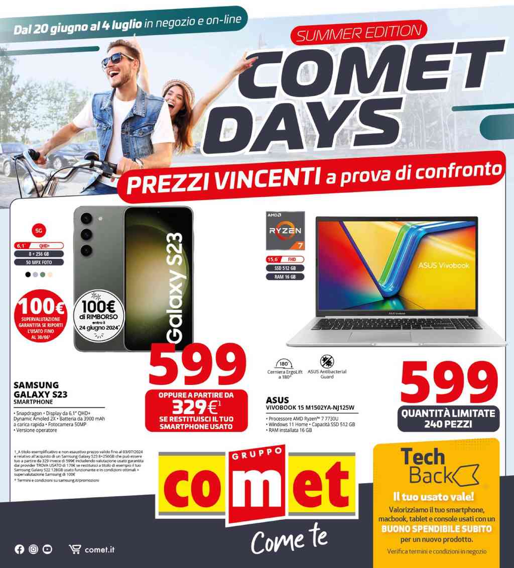 Il volantino Comet dal 20 giugno al 4 luglio 2024 ci presenta la speciale edizione estiva dei Comet Days, un’occasione per fare ottimi affari su una vasta gamma di prodotti tecnologici e di elettronica. Fin dalla prima pagina, spiccano due offerte davvero interessanti: uno smartphone Samsung Galaxy S23 a 599 €, con una supervalutazione garantita di 100 € sull’usato fino al 30 giugno 2024, e un laptop Asus Vivobook, anch’esso a 599 €.