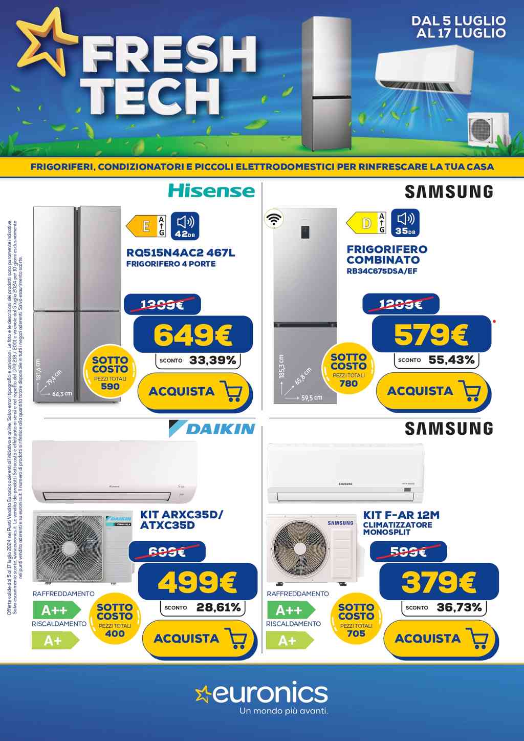 Per affrontare l’estate, Euronics propone, dal 5 al 17 luglio 2024, il volantino Fresh Tech, con promozioni su frigoriferi, climatizzatori e piccoli elettrodomestici. Tra i frigoriferi spiccano modelli avanzati come il Samsung RB38C676CS9 da 390 litri, con tecnologia All Around Cooling per una temperatura uniforme e cassetti speciali per la freschezza degli alimenti. Il Whirlpool W9C 941C OX da 355 litri offre una distribuzione omogenea dell’aria e prevenzione del ghiaccio con il sistema Cool Breeze e Total No Frost.