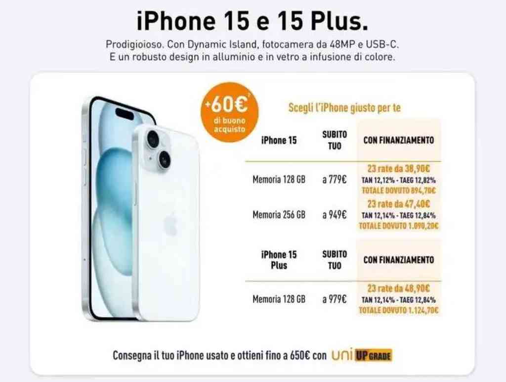 Unieuro propone fino al 28 luglio 2024 l’iPhone 15 da 128 GB al prezzo di 779 €. Inoltre, offre un piano di finanziamento in 23 rate da 38,90 € ciascuna, rendendo così l’acquisto più accessibile senza dover sborsare l’intera somma in una volta sola. Uno dei principali vantaggi dell’offerta Unieuro è la possibilità di restituire l’iPhone usato e ottenere uno sconto sul nuovo acquisto fino a 650 €. Questo aspetto è particolarmente interessante per chi possiede un modello precedente e desidera aggiornarlo senza dover affrontare un costo elevato. Restituendo il vecchio iPhone, il prezzo finale dell’iPhone 15 potrebbe scendere in modo significativo, rendendo l’offerta di Unieuro molto competitiva. Se volete leggere le altre offerte Unieuro dedicate ai prodotti Apple, sfogliate il volantino Unieuro Apple dal 22 al 28 luglio 2024.