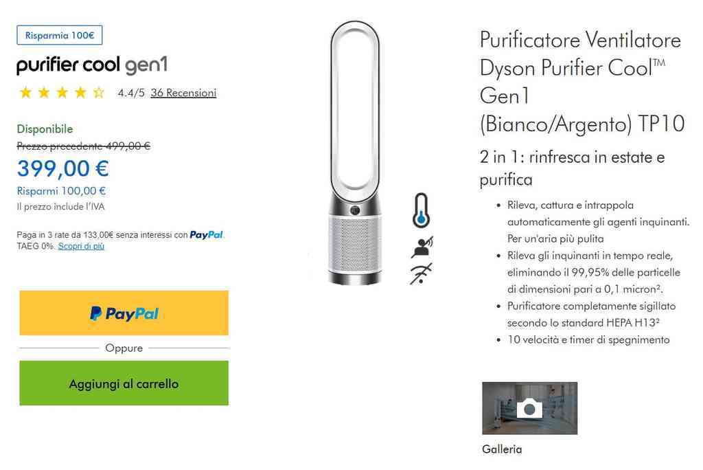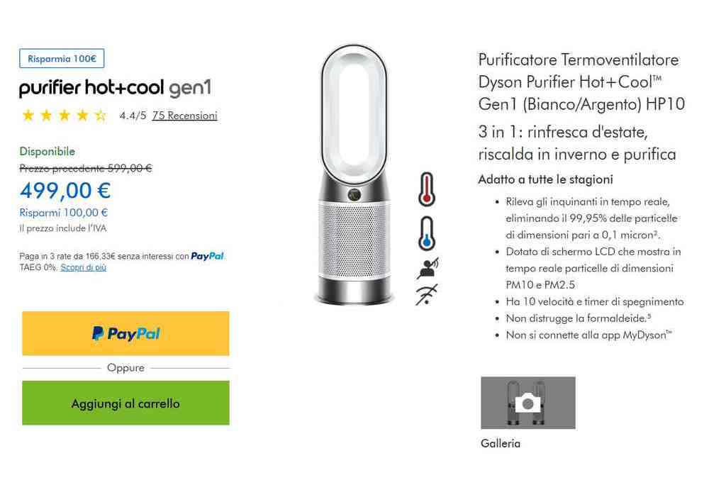 Il Purificatore Termoventilatore Dyson Purifier Hot+Cool Gen1 HP10 è perfetto per tutte le stagioni, grazie alla sua funzione 3 in 1 che permette di rinfrescare durante l’estate, riscaldare in inverno e purificare l’aria tutto l’anno. Questo dispositivo avanzato rileva gli inquinanti in tempo reale ed è capace di eliminare il 99,95% delle particelle di dimensioni pari a 0,1 micron. Dotato di uno schermo LCD, fornisce informazioni dettagliate sulla qualità dell’aria in tempo reale. Tuttavia, non si connette all’app MyDyson. Dyson propone questo dispositivo al prezzo di 499 €, già scontato di 100 €.