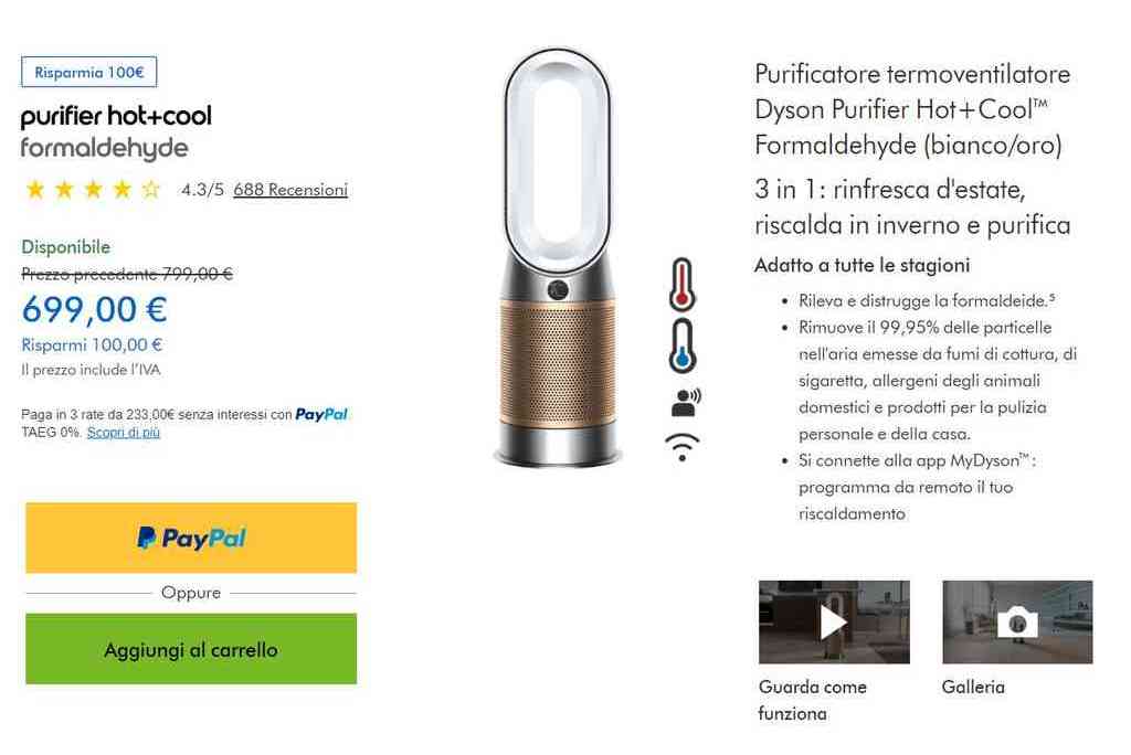 Il Purificatore Termoventilatore Dyson Purifier Hot+Cool Formaldehyde è un versatile dispositivo 3 in 1 ideale per tutte le stagioni: rinfresca in estate, riscalda in inverno e purifica l’aria tutto l’anno. Oltre a rilevare, questo innovativo apparecchio è in grado di distruggere la formaldeide, garantendo un ambiente domestico più salubre. Dotato di uno schermo LCD, offre informazioni dettagliate in tempo reale e, grazie alla compatibilità con l’app MyDyson, può essere programmato e controllato da remoto per una comodità ottimale. Attualmente, è disponibile al prezzo scontato di 699 €, con un risparmio di 100 € rispetto al prezzo di origine.