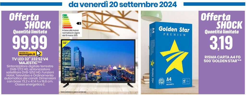 Eurospin, noto per le sue offerte competitive e per la vasta gamma di prodotti, annuncia una nuova “Offerta Shock” a partire da venerdì 20 settembre 2024. Il protagonista di questa offerta è la TV LED 32 pollici modello 232 S2 V4 MAJESTIC, proposta a un prezzo estremamente competitivo di 99,99 €. Una offerta a meno di 100 euro rappresenta un’occasione interessante per chiunque stia cercando un televisore entry-level con buone caratteristiche e praticità. La proposta è però limitata nel tempo e nelle quantità.