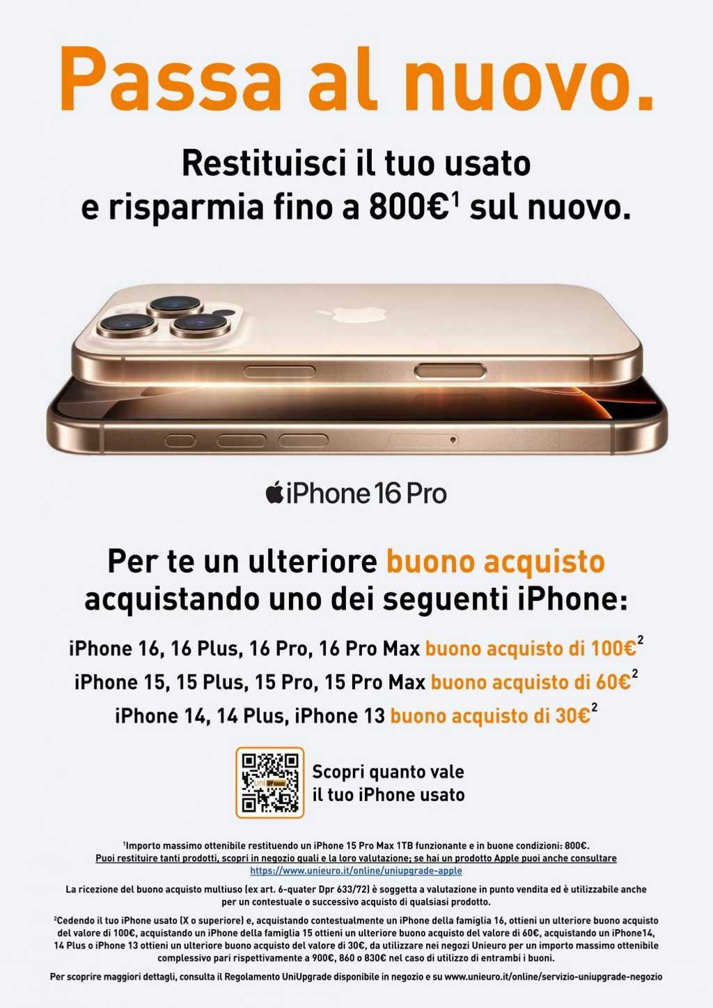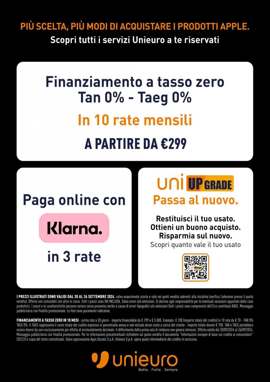 Unieuro dedica un volantino ai prodotti Apple valido dal 20 al 26 settembre 2024 con il nuovo iPhone 16, un finanziamento a tasso zero in 10 rate e la possibilità di restituire il vecchio iPhone usato. Ma le offerte comprendono anche l’iPhone 15 e altre versioni, Apple Watch Ultra 2. MacBook e molto altro ancora. Ecco tutto il nuovo volantino da leggere.