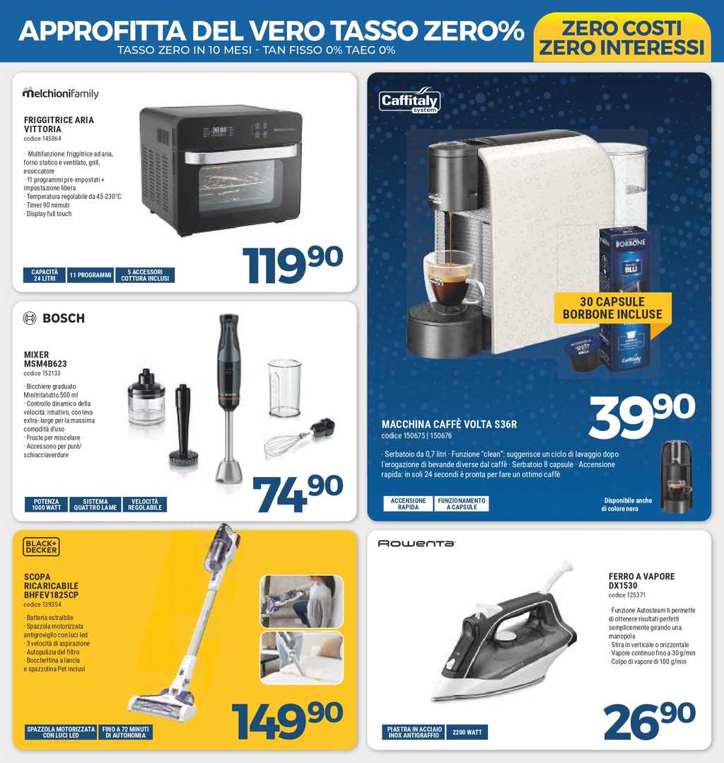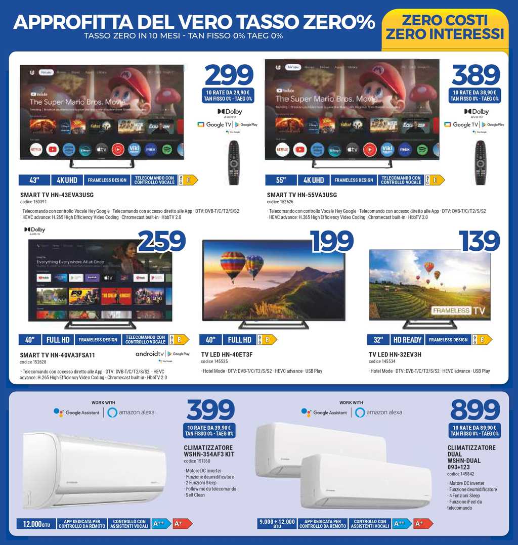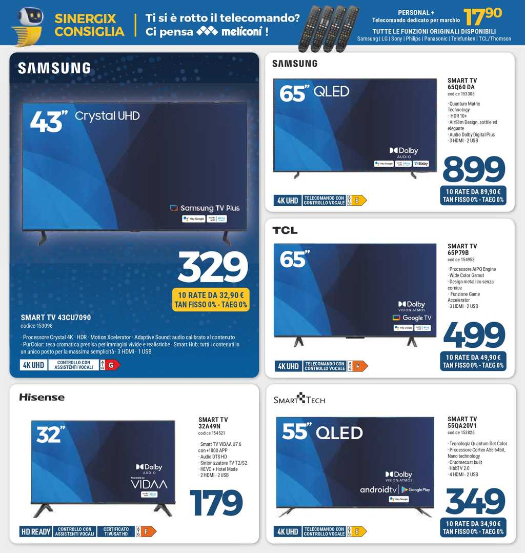 Sinergy propone una vasta gamma di elettrodomestici e prodotti tecnologici a tasso zero. Tra le offerte principali troviamo lavatrici con motore inverter e opzione vapore, asciugatrici dotate di tecnologie innovative come la funzione MixCare, e Smart TV con risoluzione 4K UHD e controllo vocale integrato. I frigoriferi presentano tecnologie all’avanguardia, come HarvestFresh che riproduce il naturale ciclo solare all’interno del cassetto frutta e verdura. Il volantino include inoltre piccoli elettrodomestici come frullatori e friggitrici ad aria, e prodotti per la pulizia della casa come scope ricaricabili e ferri da stiro, tutto con il vantaggio di poter pagare senza interessi.