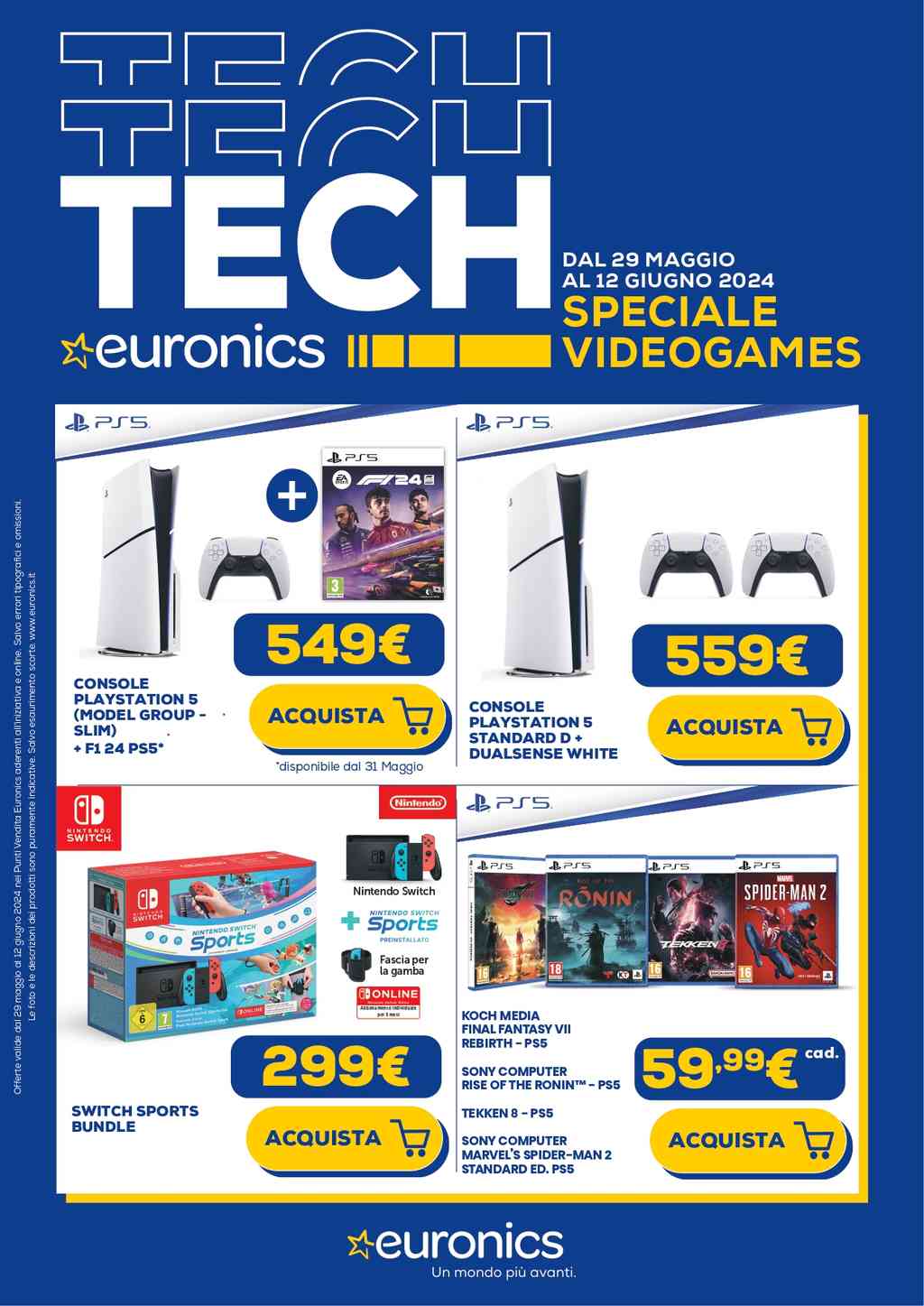 Il nuovo volantino Euronics Videogames dal 29 maggio al 12 giugno 2024 è ricco di offerte per gli appassionati di gaming, sia che abbiano in casa la Playstation o la Nintendo Switch, ma anche nel caso in cui stiano cercando offerte per acquistare la nuova console, così come tanti accessori, dal visore Playstation VR2 a controller e cuffie gaming, per concludere con le gift card di Nintendo eShop, Playstation, Xbox, Roblox, ma anche il Microsoft Xbox Ultimate Game Pass di 1 mese.
