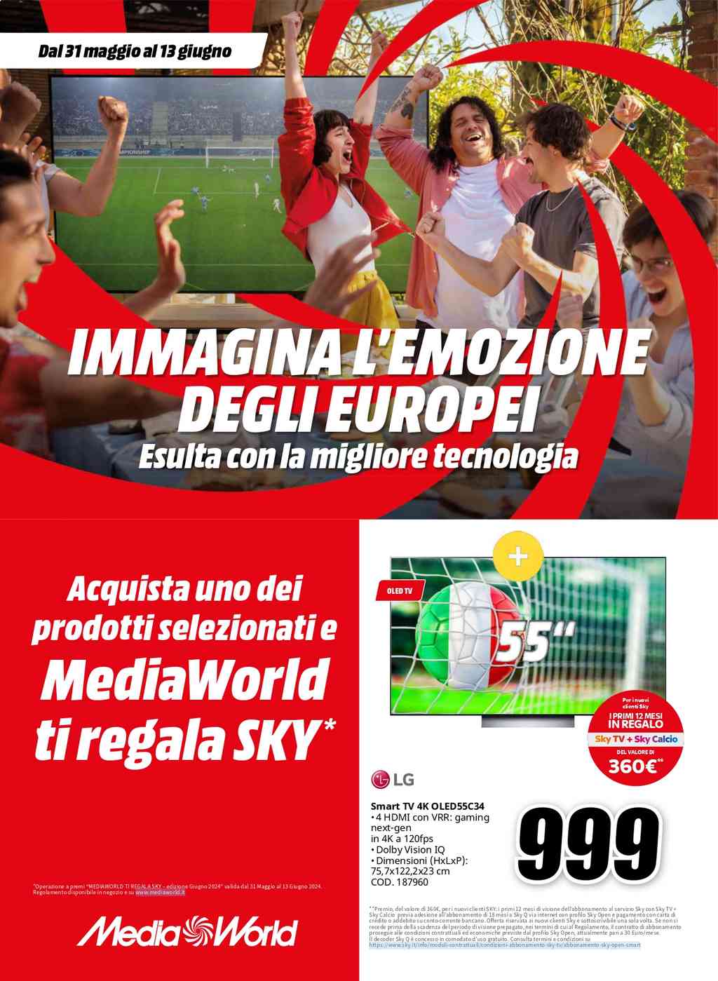 Il volantino Mediaworld dal 31 maggio al 13 giugno 2024 inizia con la promozione dedicata agli Europei 2024, grazie alla quale si potrà avere in regalo un anno di abbonamento di SkyTV + Sky Calcio acquistando uno dei prodotti selezionati da Mediaworld, tra cui troverete alcune TV, soundbar, ma anche fotocamere e drone, monopattini ed e-bike, smartphone e smartwatch, notebook, la PS5 e anche alcuni elettrodomestici.